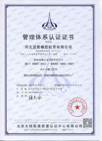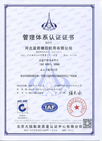 我公司是河北省首批通過國家IS09001:2000質(zhì)量管理體系認(rèn)證的膠帶生產(chǎn)企業(yè)。通過獲得和認(rèn)真執(zhí)行此認(rèn)證使我公司建立了優(yōu)良的企業(yè)架構(gòu),和良好的質(zhì)量管理體系,在客戶方面贏得了信譽。